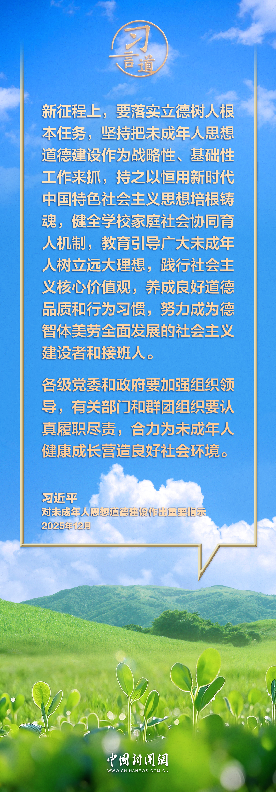 习言道|合力为未成年人健康成长营造良好社会环境来源:中新网2025-12-25 13:47:26 中共中央总书记、国家主席、中央军委主席习近平近日对未成年人思想道德建设作出重要指示。习近平指出——编辑:曾传娟终审:马康华版权归原作者所有文章内容及图片请联系我们将及时处理
